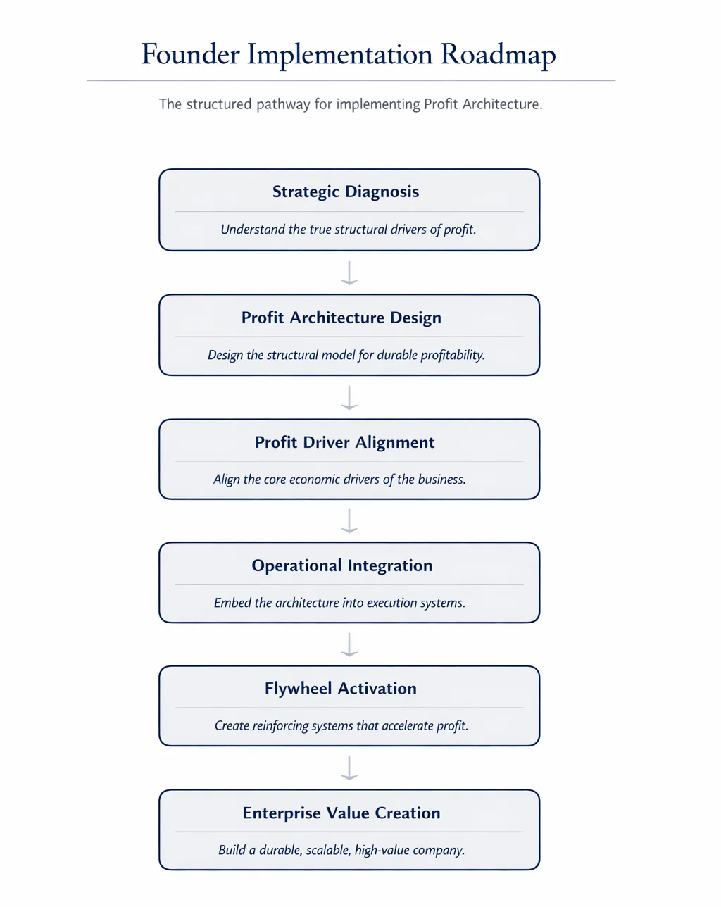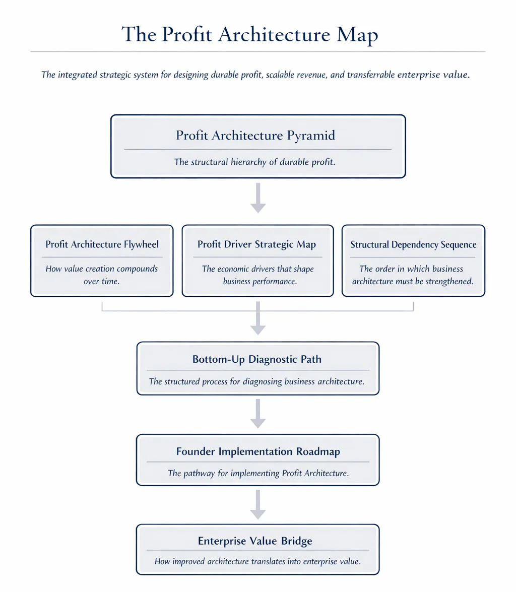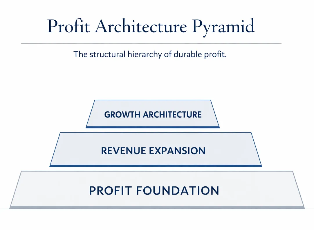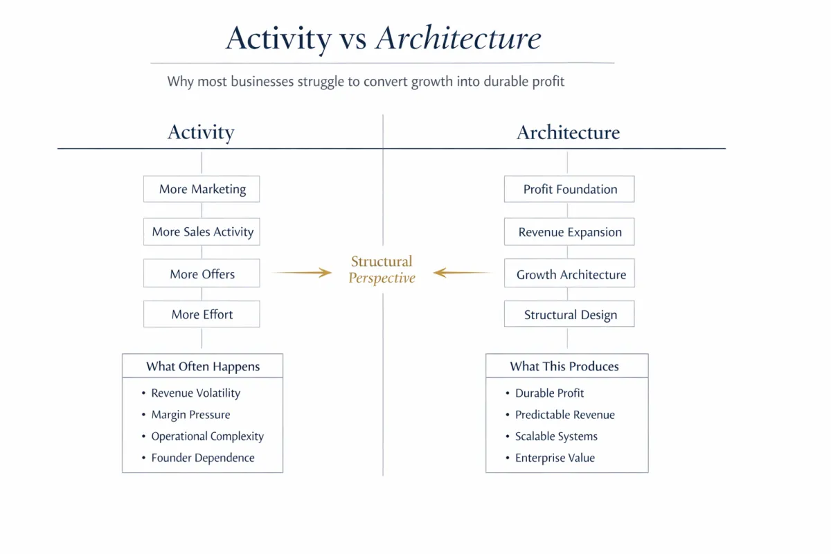 The advisory work centers on the Profit Architecture methodology, a strategic system for designing businesses capable of producing durable profit, scalable revenue, and transferable enterprise value.